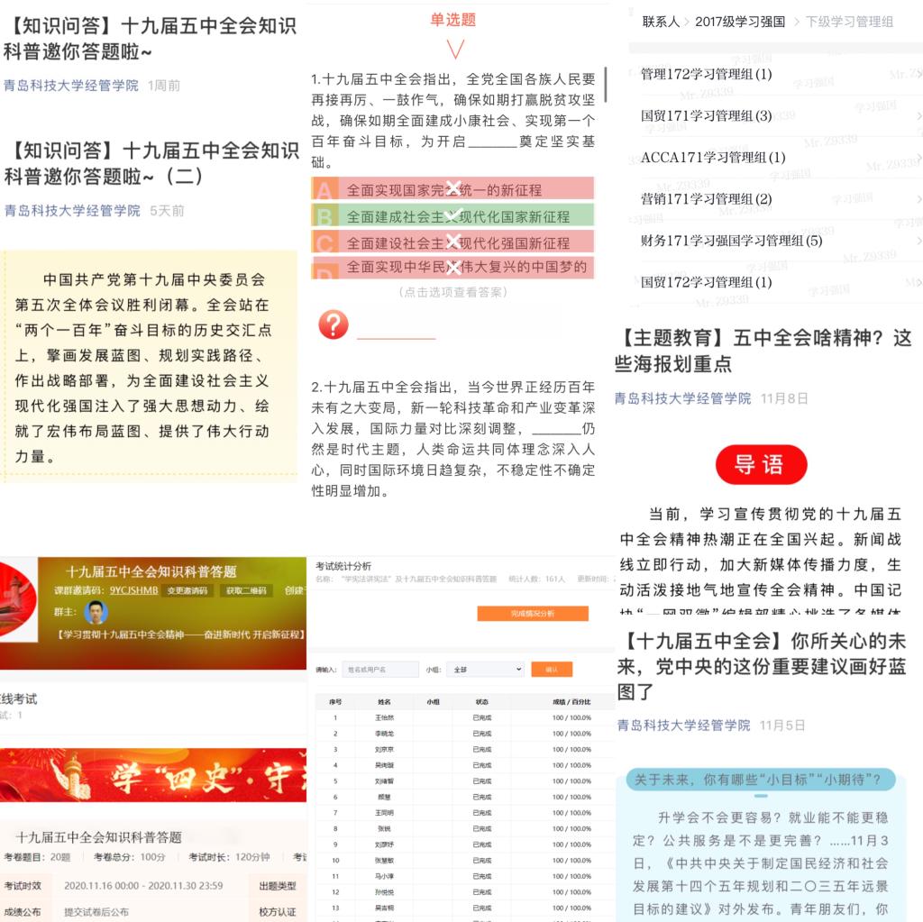 利用学习强国、学院官网、官微等平台,强化网络育人输出,构建网格化教育格局。利用学习强国班级群实现“联学”,以教师引导与学生自学的方式,把握强国教育资源,深化交流研讨,确保内化于心。利用学院公众号平台实现“点学”,通过推送十九届五中全会“规划蓝图”,发布十九届五中全会热点要闻等系列“主题教育”,引导学生了解全会重点热点,心系发展难点、关注青年工作结合点。利用易班及公众号平台实现“精学”,组织十九届五中全会线上答题竞赛系列活动及“关键词”系列教育,引导学生聚焦全会细节,以喜闻乐见的方式,学细学精全会精神。