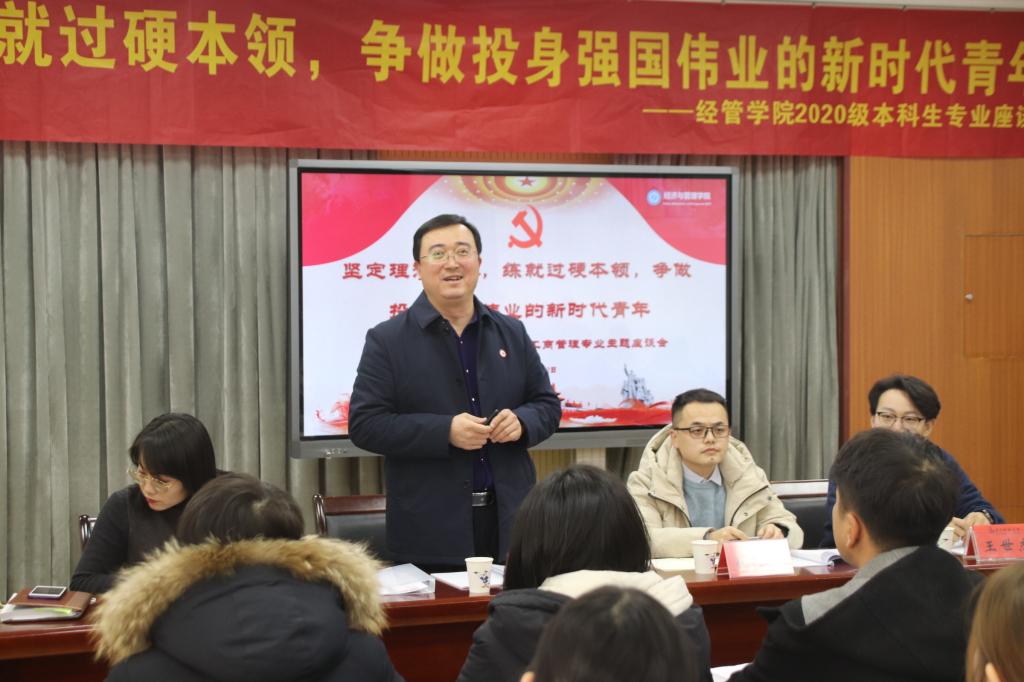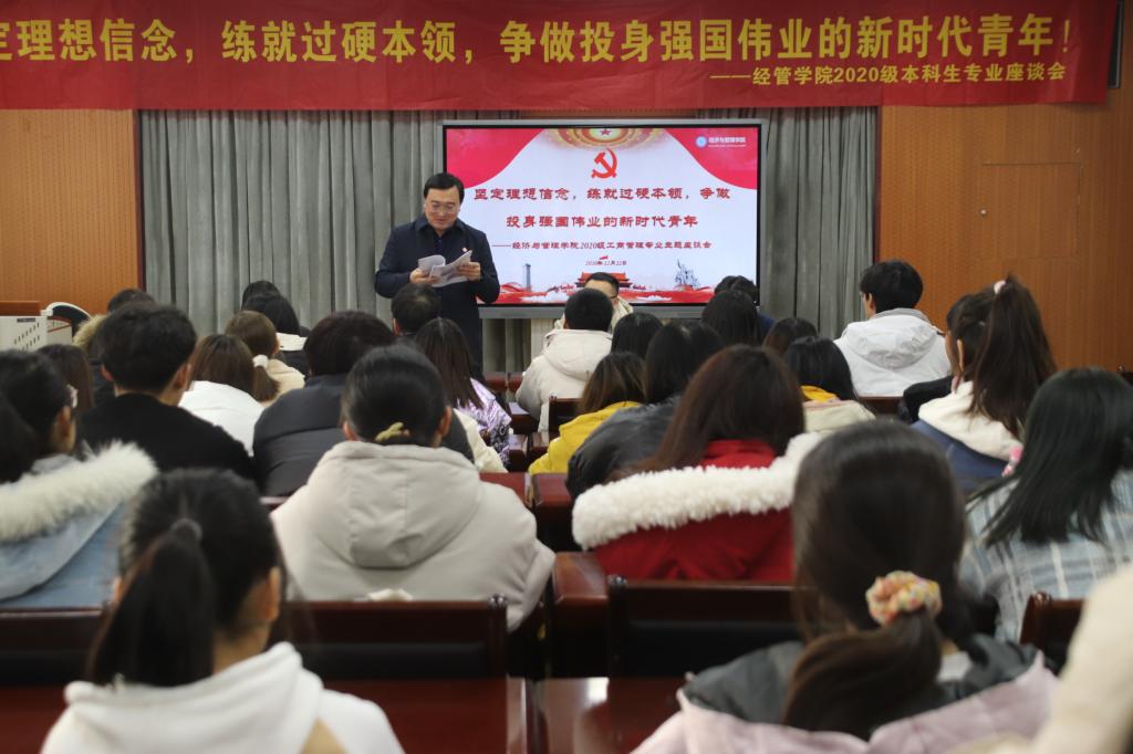 2020级工商管理专业“坚定理想信念,练就过硬本领,争做投身强国伟业的新时代青年”主题座谈会于学院504会议室举行,党委(校长)办公室副主任匡荣富出席此次座谈会,与同学们亲切交流,从职业生涯规划出发畅谈使命担当。2020级工商管理专业班主任代同亮、新生辅导员及领跑学长共同参加,座谈会由20级辅导员付凯主持。