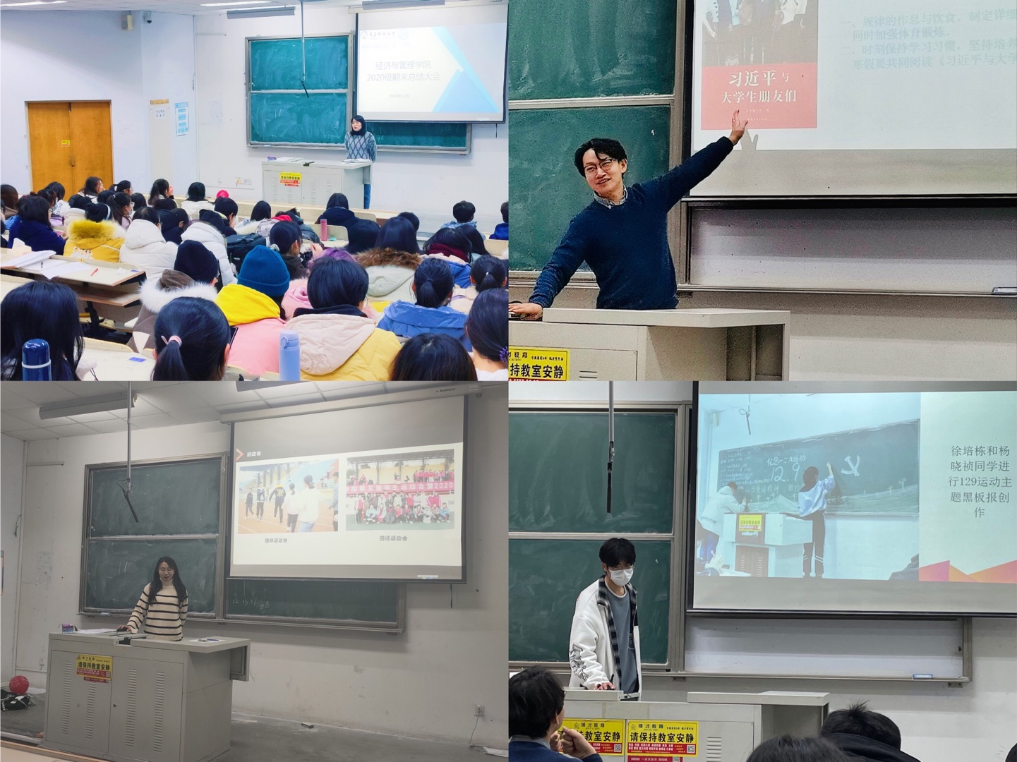 于弘毅楼E304、E306分专业召开2020级本科生期末总结暨考风考纪与安全教育大会。会议由2020级辅导员付凯、王世杰主持,2020级全体学生参加。