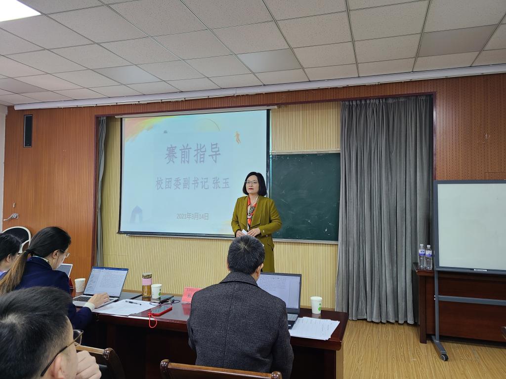 答辩会开始前,校团委副书记张玉为全体人员作专题培训,她指出,第一,学生作为参赛主体,要参与到比赛的全部环节,不断提高自身创新能力和技术水平;第二,要充分利用寒暑假社会实践的契机,去一线调研,在实践中历练真知;第三,要广泛收集市场和相关部门的评价,建立完善的反馈意见机制,不断提升作品的社会满意度和认可度。