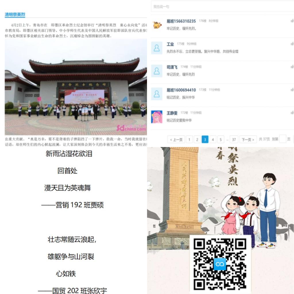 易班工作站于清明节来临之际发布快搭,鼓励同学们积极参与传统节日,网上祭英烈。此次活动帮助同学们更加了解清明节这一传统节日的演变和主要习俗,深入探讨了清明中承载的中华民族独特的精神与共同记忆,搭建了将党史学习和缅怀英烈相融合的桥梁。快搭中更设置了评论版块,为经管学子提供了抒发情感,寄托哀思的途径。同学们更是通过三行诗和网页H5的创作让红色种子在心灵深处生根发芽,用我们的初心使命解锁我们党“从哪里来”“向何处去”的精神密码。