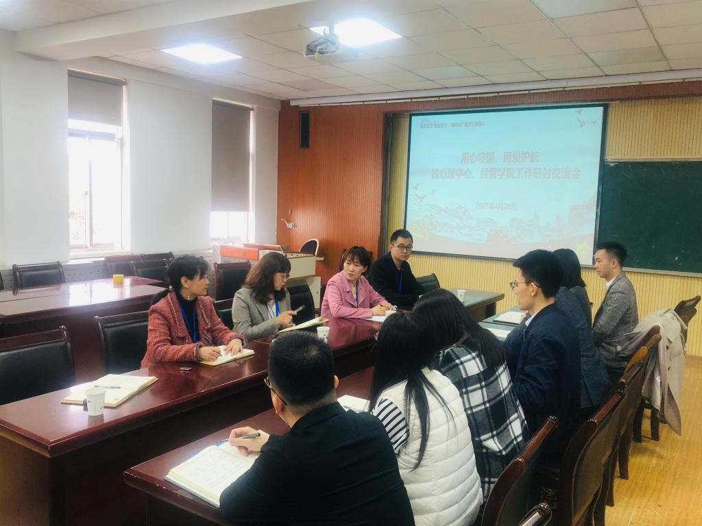 工作研讨交流会在经管楼419举行,学生处副处长王丽出席会议,心理中心主任李海玲,心理中心魏玉杰、王岳飞,成人直播平台