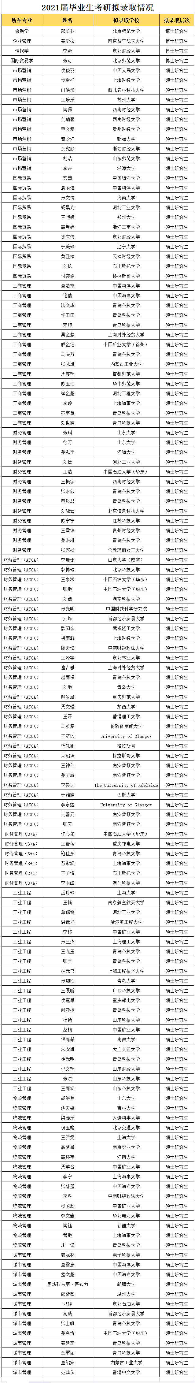 捷报频传,截至目前,学院2021届硕士研究生有4人成功考取博士研究生,2021届本科生中有134人被中国人民大学、山东大学、上海财经大学等知名高校录取为硕士研究生,本科生总体升学率达26.43%(国内升学率22.68%)。升学录取名单如下: