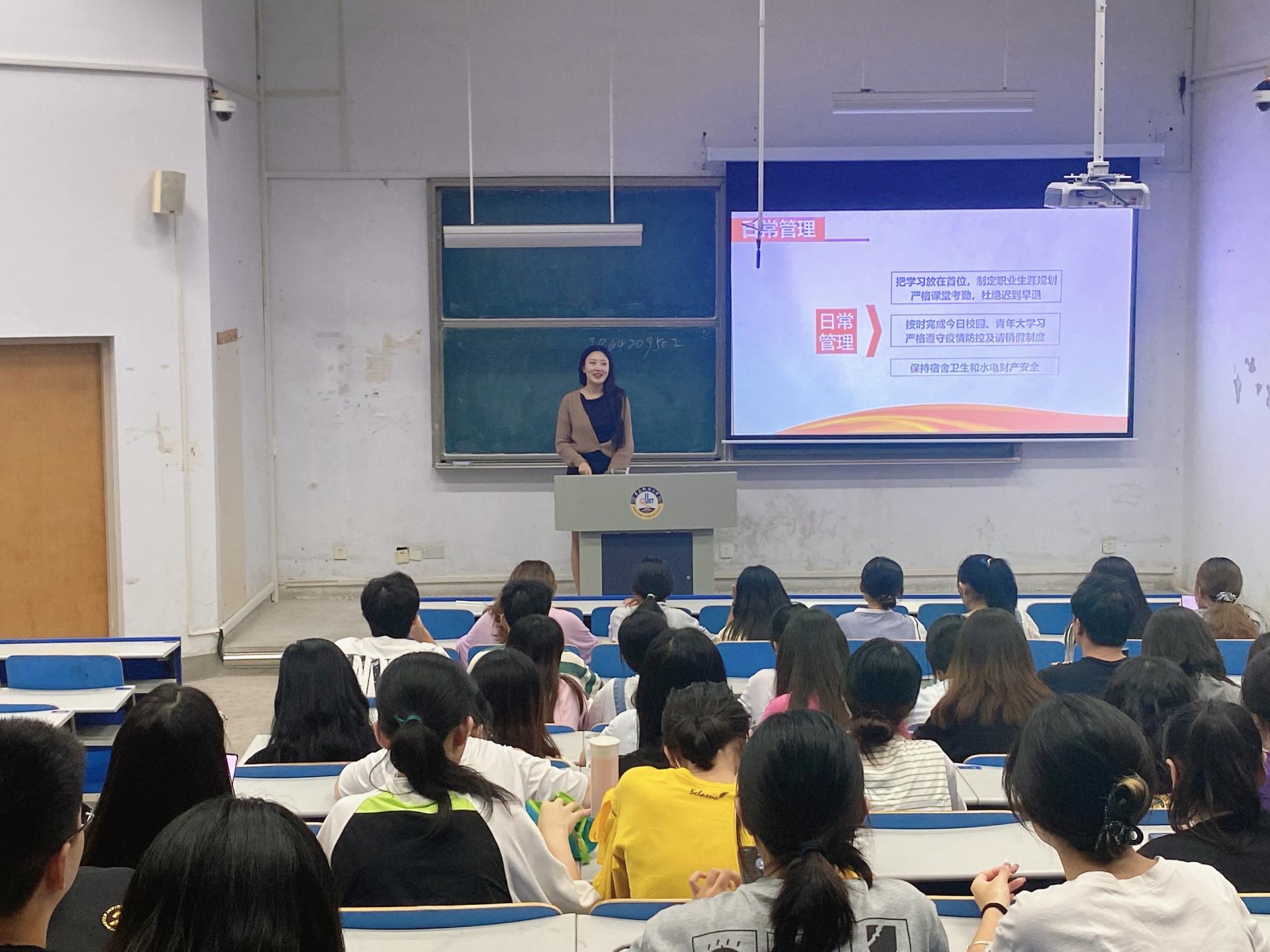 规范日常管理,落实疫情防控要求。随后,付凯强调了在疫情防控形式下的校园日常管理要求,要求同学们强化大局意识和责任意识,严格落实学校秋季学期疫情防控工作的各项要求,按时按要求填报“今日校园”,认真遵守出入校园请销假制度,履行扫码登记和体温检测等措施,坚决杜绝麻痹思想、侥幸心理;保持宿舍卫生和用水用电安全,鼓励学生充分利用“爱体育”APP,不断加强身体素质锻炼;提倡文明上网,不断提高辨识能力,谨防网络诈骗,进一步保障财产安全。