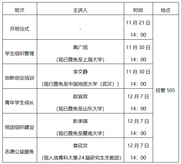 8.特色培养——根据工作实际,从学院高年级学生骨干中选聘“青马工程”培训班青年讲师团成员,围绕学生组织管理、创新创业培训、班团组织建设、志愿公益服务进行特色培养,具体如下: