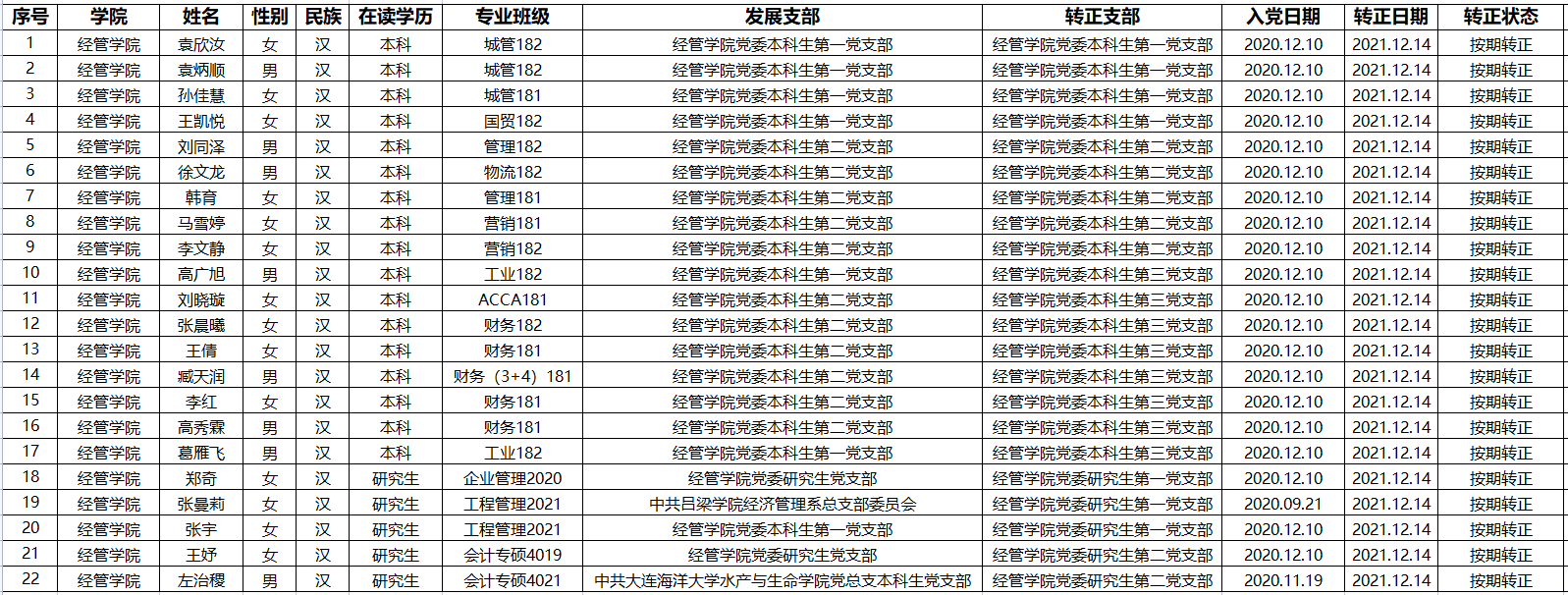 本科生党支部、研究生党支部于2021年12月14日召开预备党员转正大会讨论袁欣汝等22位同志的转正问题,同意以上同志按期转为中共正式党员,现将该22名同志情况予以公示。公示期为2021年12月14日至2021年12月21日。如有异议,请于公示期内到成人直播平台