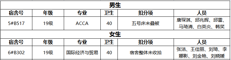 在本次的检查中,除了对宿舍整体卫生情况进行例行检查外,还对消防安全、违禁电器使用进行了重点检查,不合格宿舍如下:
