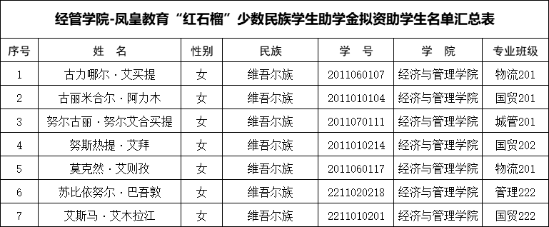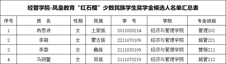 为深入贯彻落实党和政府的民族政策,加强对少数民族学生的培养,激励我院少数民族学生勤奋学习、努力进取,在德、智、体、美、劳等方面得到全面发展,根据学校2023年度凤皇教育“红石榴”少数民族奖助学金评选要求,通过自主申报、公开评审等环节,确定奖学金人选4人,助学金受助人选7人,公示如下: