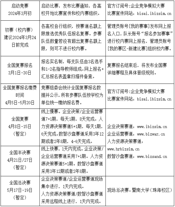 2024年全国企业竞争模拟大赛分校内初赛、全国复赛、全国半决赛、全国总决赛,具体赛程安排如下: