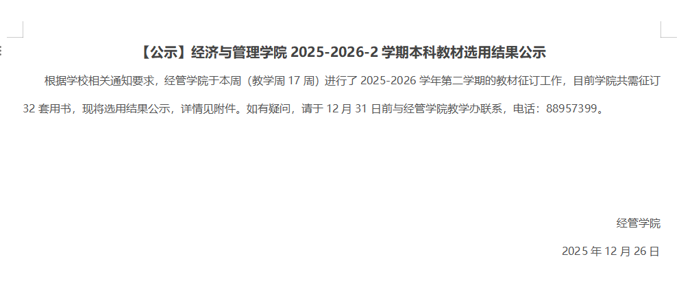 【公示】成人直播平台 2025-2026-2学期本科教材选用结果公示