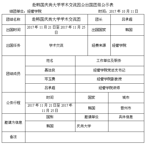 根据因公临时出国公开公示的有关规定,现将聂法良、邓玉勇、吕承超因公出国团组相关内容和参团人员名单予以公示。公示时间为2017年10月11日至2017年10月15日(5个工作日)。如有不同意见,请在公示期内,向成人直播平台 单位(电话:88957399)反映。