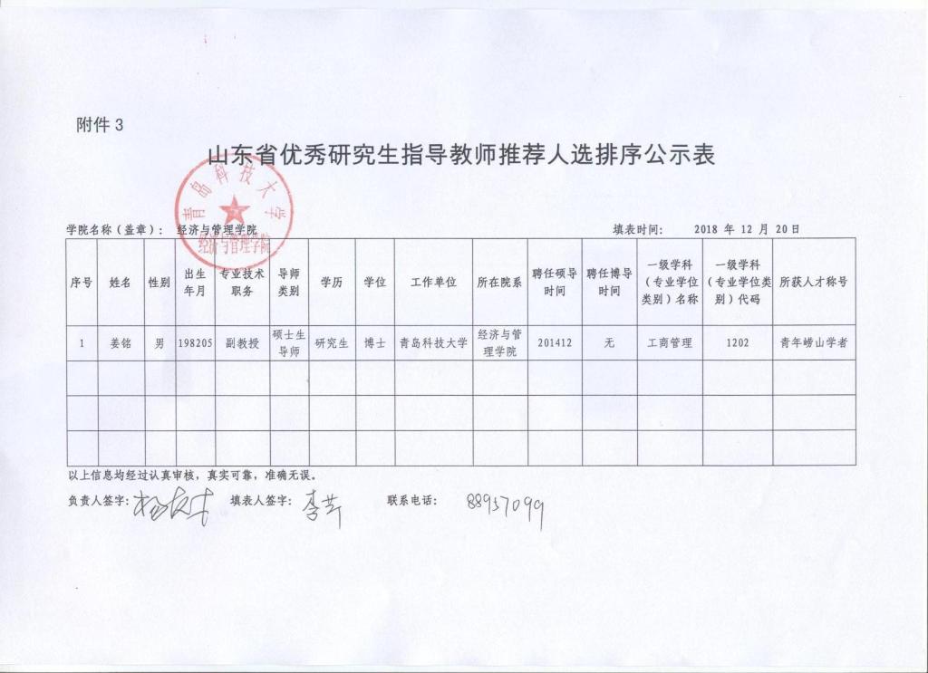 成人直播平台 根据研究生院《关于推荐第五届山东省优秀研究生指导教师人选的通知》,组织老师积极申报,截止申报时间,只收到姜铭老师的申请,特此公示。