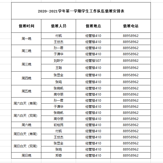 2020-2021学年第一学期学生工作队伍值班表