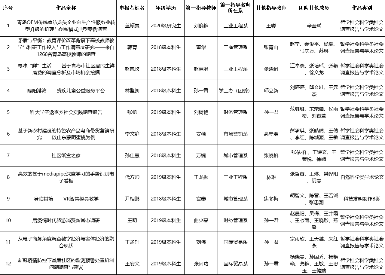 学院组织7名专家(其中2名院外专家,3名院内专家,2名企业专家)对参赛作品进行了评审。根据评审结果,现确定以下12件作品晋级院赛决赛,晋级团队名单(按照申报者姓氏笔画排序)如下: