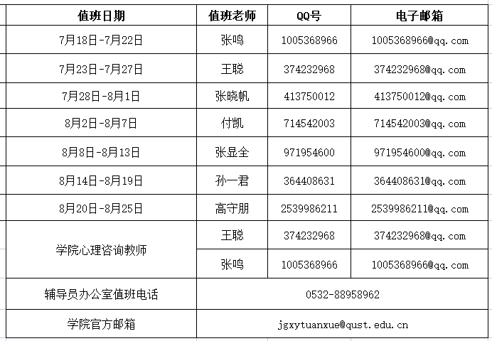 秋季学期开学通知及其他注意事项将通过学院官方网站、微信公众号及年级QQ群发布,为确保信息畅通,助力学子安全和谐度过假期,在此公布学院官方网站、官方微信、值班电话及各年级辅导员联系方式,如遇特殊情况,请及时报备学院并主动与辅导员老师联系: