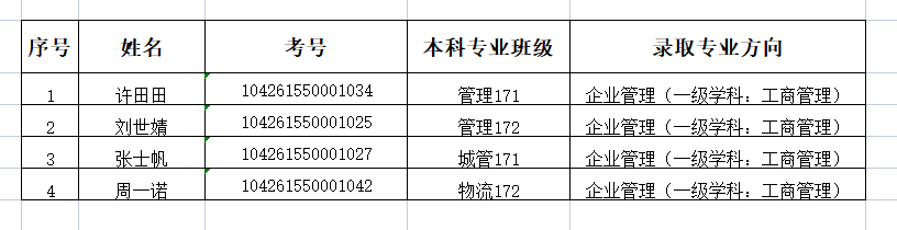 为了提升学术型研究生招生质量,鼓励我院崂山校区优秀本科毕业生第一志愿报考我院学术型研究生,根据学院研究生新生奖学金(学院自设)评选办法,我院管理171班许田田等4名同学获得研究生新生奖学金,奖励人民币6000元,名单公示如下: