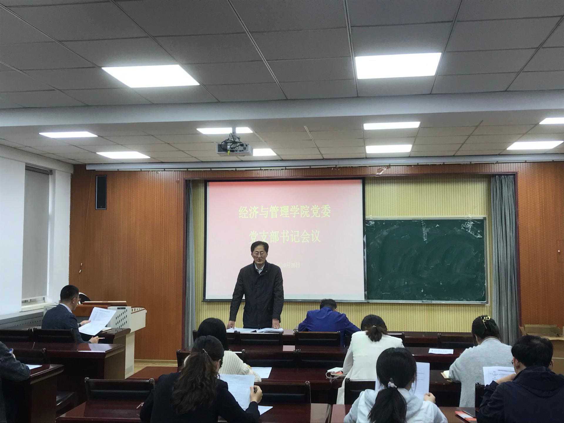 党委于经管楼419会议室召开党支部书记会议暨党建工作规范部署会,全体党支部书记参与会议,会议由党委书记李德成主持。