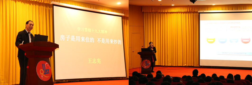 报告会上,王志宪作了题为《学习贯彻十九大精神之房子是用来住的不是用来炒的》的报告,介绍了三次党代会对房子的表述、房价问题和影响房价的因素,并对我国未来房价进行展望,以社会关注的房子问题为切入点,使十九大精神深入人心。董华在《十九大报告之建设现代化经济体系的解读》报告中,运用大量案例对十九大报告中提出的“推动互联网、大数据、人工智能和实体经济深度融合”进行解读与剖析,提高了师生们对互联网经济的认知。孙在东作题为《十九大报告的新思想,新论断,新提法,新举措》的报告,对新时代“举什么旗”,“走什么路”,“应有什么样的精神状态”等问题着重展开论述,引领广大师生深入学习贯彻十九大报告中体现的“四个新”。郭慧志则从十八大与十九大军事方面的差异入手,带来《党的十九大与新时代军事变革》的报告,突出习近平总书记在十九大上提出的“坚持走中国特色强军之路,全面推进国防和军队现代化”的论述,为师生分析了十九大军事改革的主要特点与难点,讲解了十八大以来的军队与国防改革问题。