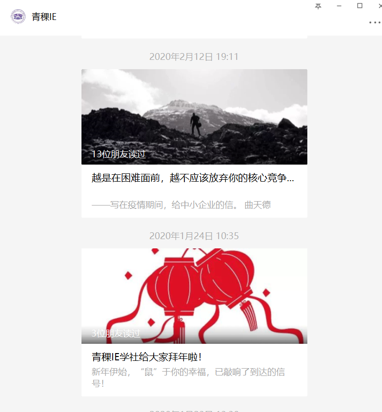 积极发挥学生党员和积极分子的作用,停学不停课,积极开展各项学生工作。在思想建设方面,同学们积极跟进工业工程系党支部开展“不忘初心、牢记使命”主题教育,青稞IE学社微信公众号时刻保持内容更新,定时发布专业知识和党建学习材料,为全系同学思想建设开辟了道路,使同学们不断向党组织靠拢。在学业和成长方面,为解决同学们对专业学习以及就业深造方面的信息不对称问题,我系党员老师积极联系和鼓励同学们加入专业性在线教学平台,接触大量企业协调部署空中招聘,第一时间给同学们分发疫情防控、学业保障和考研就业的相关信息。使得同学们获得了很多宝贵的知识经验,丰富了疫情期间的学生阅历,强化了专业自信心,众志成城,共克时艰。在活动方面,师生党员和积极分子积极策划,以青稞IE学社为门户,举办全系师生线上读书会,让爱好书籍的学生参与进来,更加丰富了课外生活。在新年伊始,师生协作拍摄了新年祝福视频,温暖了专业大家庭里的每一个成员。