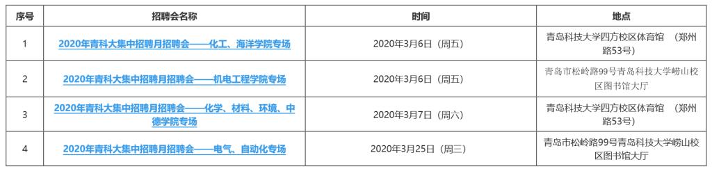 为全面学习贯彻习近平新时代中国特色社会主义思想和党的十九届四中全会精神,贯彻落实国家、山东省、青岛市关于促进高校毕业生就业创业的决策部署,促进毕业生更多渠道更高质量更加充分就业创业,学校将于2020年3月-4月举行“2020年青科大集中招聘月”活动,诚挚邀请各用人单位到校招聘,企业报名方式详见招聘会链接;欢迎广大毕业生积极参加。