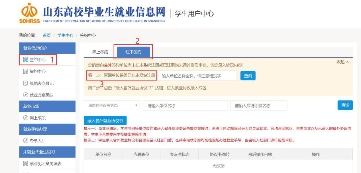 毕业生登录信息网,点击“签约中心”-“线下签约”-“查询单位是否已在本网站注册”,准确录入用人单位名称,如果在省信息网能够查到,则具备网签资格,否则,需要用人单位注册省信息网。