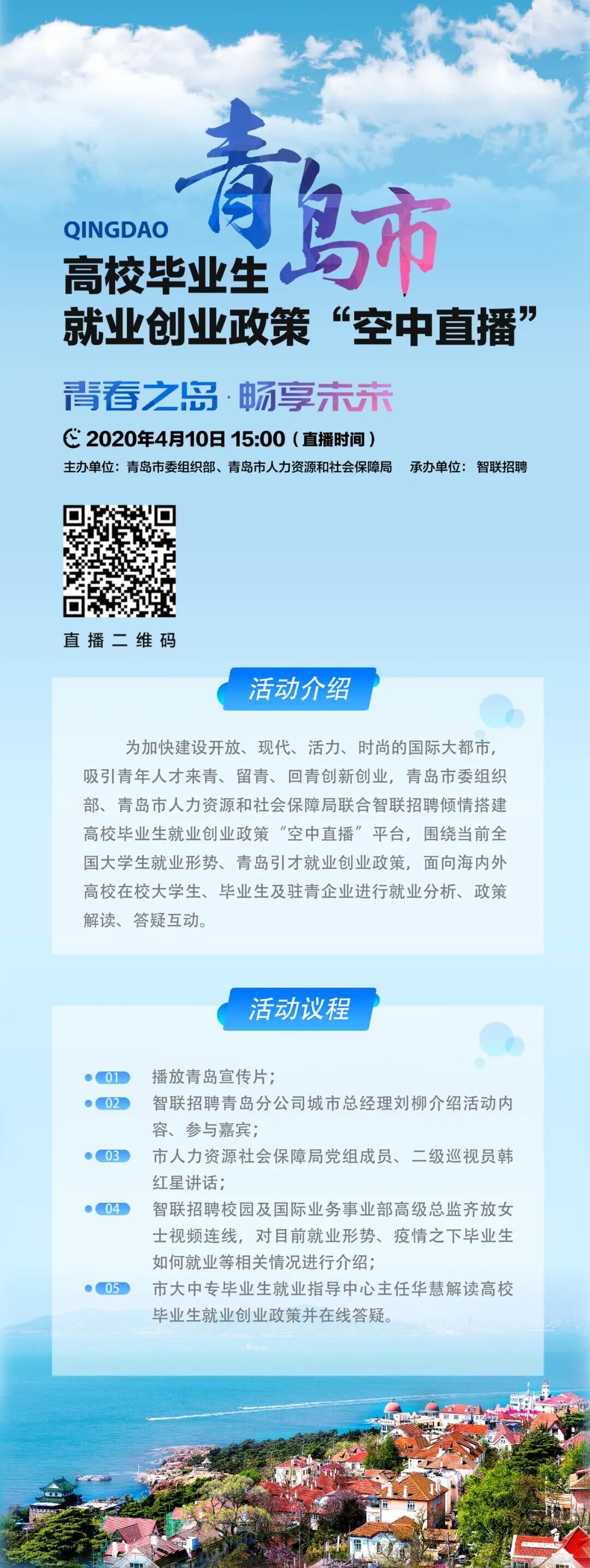 为加快建设开放、现代、活力、时尚的国际大都市,吸引青年人才来青、留青、回青创新创业,联合智联招聘搭建高校毕业生就业创业政策“空中直播”平台,围绕当前全国大学生就业形势、青岛引才就业创业政策,面向海内外高校在校大学生、毕业生及驻青企业进行就业分析、政策解读、答疑互动。拟于2020年4月10日举办“青春之岛·畅享未来”青岛高校毕业生就业创业政策“空中直播”活动。
