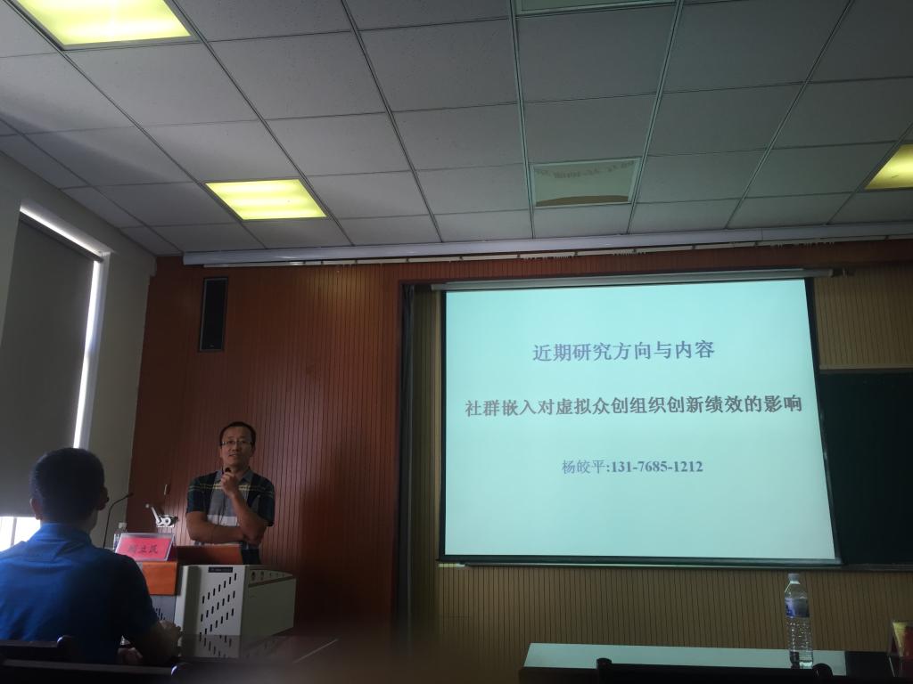 杨皎平老师做了精彩的演讲,他在简单介绍了其最近的“社群嵌入对虚拟中创组织创新绩效的影响”研究课题之后,与老师们分享了其课题申报的一些经验,为同学们解读了如何写好论文,提升科研能力。他认为,“团队合作”是如今科研人应具备的品质,并强调 “厚基础,知前沿”的重要性。