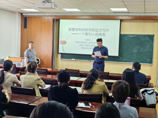 5月27日,学院邀请国家自然科学基金委A类期刊《系统工程理论与实践》的主编杨晓光老师,为全院师生带来了一场题为“经管学科的研究和论文撰写:一个期刊人的视角”的专题讲座。杨主编结合自己丰富的期刊工作经验,强调了科技论文撰写的规范性对于提升研究水平、推动学术进步具有重要意义。随后,他结合具体案例,分析了优秀科技论文的特点和撰写技巧。杨主编鼓励师生在研究中勇于探索、敢于创新,在撰写中注重细节、精益求精。此次讲座不仅让师生们掌握了科技论文撰写的规范和要求,还激发了大家对科研工作的热情和信心。