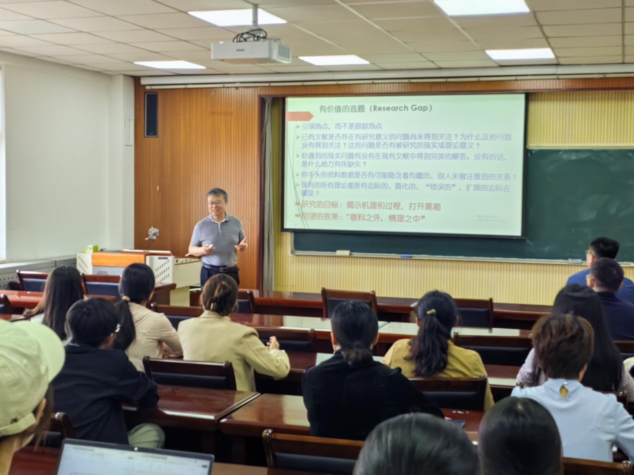 杨教授用简洁幽默的语言和生动形象的比喻一个期刊人的视角为大家进行了经管学科的研究和论文撰写的讲解。首先,他强调撰写论文要引领热点,而不是跟踪热点,要筛选有价值的选题。在进行论文写作中,要感知现实世界,也要把握研究价值。他表示做研究的过程就好似勘查“案发现场”,要细致入微,发现差距和研究的深层意义。其次,要厘清研究范式。要确定研究在学术探索海洋中的位置,明确自己研究的新的贡献点。再次,清晰的研究方案也是撰写论文必不可少的环节。应该能够提供问题研究重要性的充分资料,避免“伪命题”的产生。最后,也要厘清研究的边际贡献。杨教授引经据典,对论文撰写的内容和研究角度进行了深入浅出的分析和总结。另外,教授还总结了科学研究的四条准绳,各类文章的基本要求等,与会师生受益匪浅。