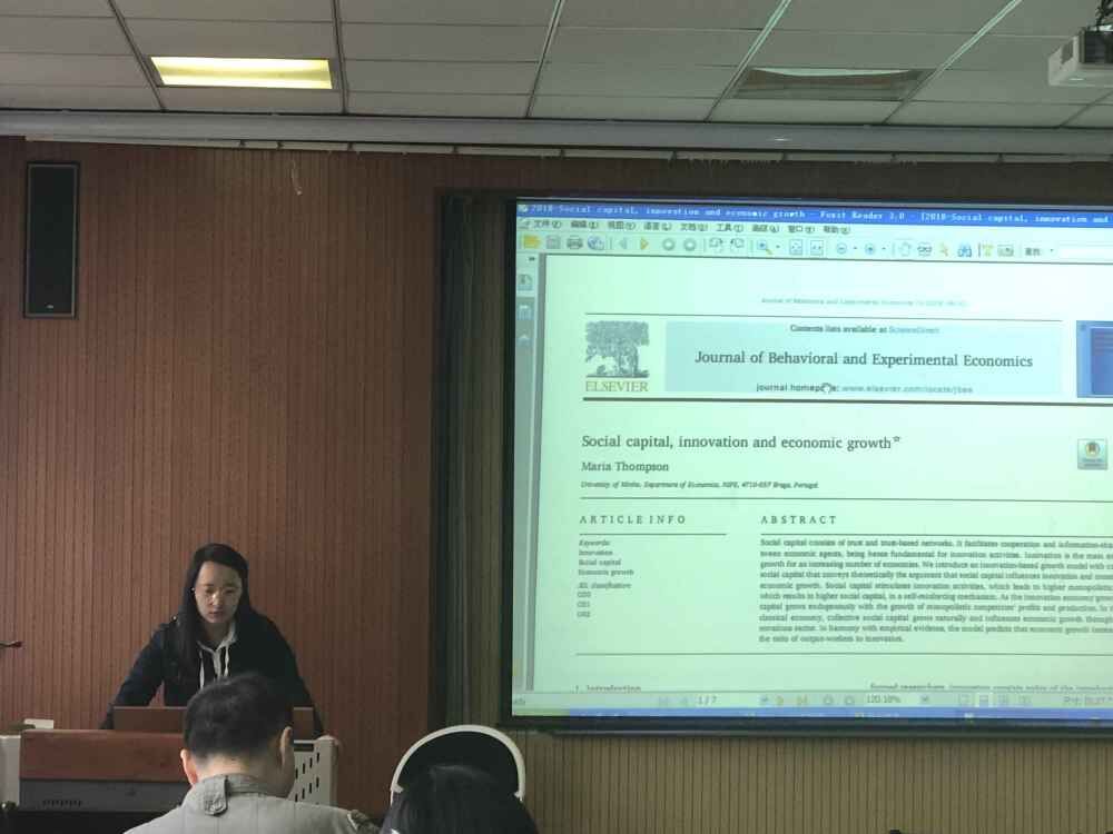 论坛开始,2017级金融学研究生王希向在座师生汇报了题为《社会资本、创新与经济增长》的论文,该文于2018年发表于Jouranl of Behavioral and experimental economics期刊,该论文主要通过构建社会资本、创新与经济增长之间的数学模型,进行稳态求解,得出经济发展的稳态增长率水平。目前多数论文主要研究社会资本与创新或者创新与经济增长两两变量之间的关系,而该论文的创新点在于对这三者之间的关系进行了思考。但该论文的不足之处是未将社会资本引入消费者的效用方程,这将是我们后续研究的一个方向和创新点。杨友才副院长对该论文做了总结点评,并阐述了其精彩的创新思路。