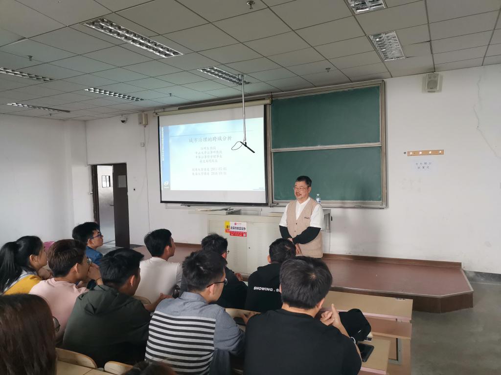 会议开始,杨院长首先对汪明生教授来我院分享其研究成果表示热烈欢迎,对其生平经历和学术工作成果进行介绍并给予高度赞扬。随后,汪教授结合自身研究内容,向师生们作了题为《城市治理的跨域分析》的精彩报告。该报告主要涵盖了城市管理复杂系统的治理结构、物质主义与后物质主义、跨域的定义及养成、公共事务研究方法等十七个方面的内容,汪教授围绕这些方面对城市治理的相关研究进行了详细讲解,使同学们更深入的认识和学习城市管理的复杂系统与相关研究方法。