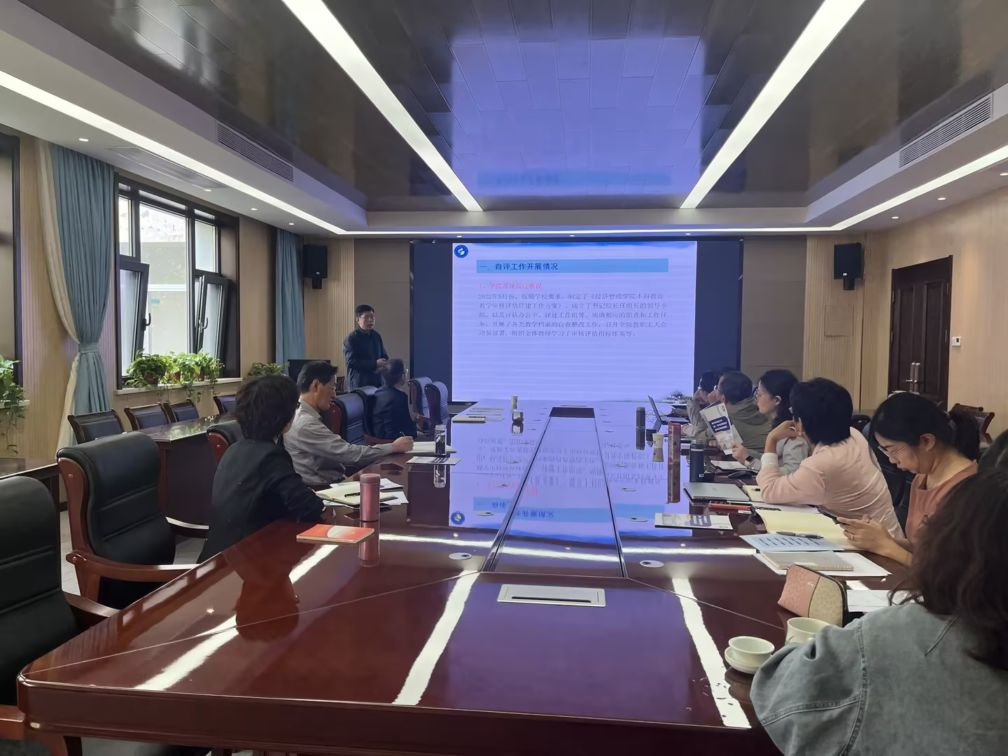 马院长从自评工作开展情况、制定学院审核评估报告、学院参与的审核评估工作和专家问到的主要问题四方面向参会老师讲解山科经济管理学院评估全过程。马院长结合自身工作细节,向老师们详细阐述准备过程中学院所做的各项工作,对老师们审核评估准备过程中的困惑进行了一一解答,逻辑清晰,实践操作性强,对我院进一步推进审核评估自评自建各项工作具有重要的学习实践意义。