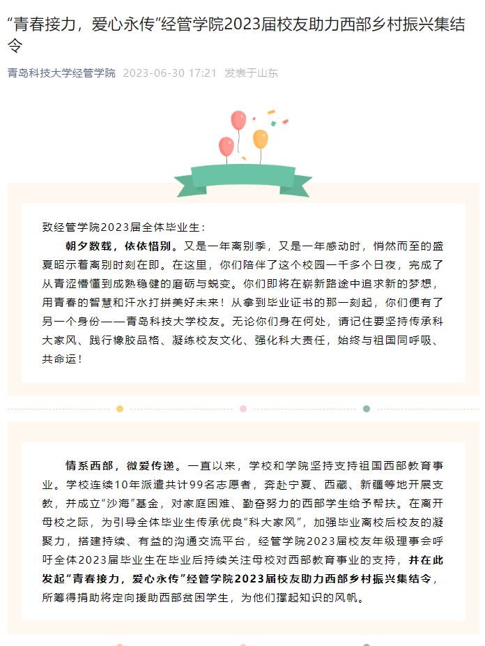 2023届校友助力西部乡村振兴集结令,呼吁同学们于每年6月29日毕业离校日发起募捐,通过学校团委“沙海”基金定向捐助西部贫困学生,并每年及时更新历年全部受捐助西部贫困学生的学习、生活等成长记录。6月24日、25日,学院在南苑5、6号楼楼下设置闲置物品捐赠回收点,呼吁2023届毕业生将闲置的书籍、文具、衣物等捐赠西部地区,教育引导青年学生勇于担当,情系西部,共同推动西部教育事业的蓬勃发展。
