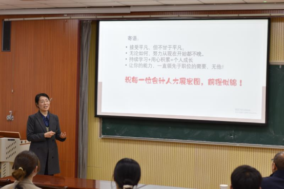 随后于老师对本次报告会做了总结,指出“成功=目标×行动×方法”。就职业发展而言,目标就是要通过职业规划确定职业目标,要确定好自己研究生期间的规划。在行动方面,要努力提高职业素养和职业技能,在研究生就读期间就要锻炼自己守时、认真、积极主动、高质量完成任务的职业素养,要培养自己的财务系统使用、办公软件应用、专业分析能力、沟通技能等多方面的能力,要通过向他人学习、思考总结等方式掌握行动的方法。